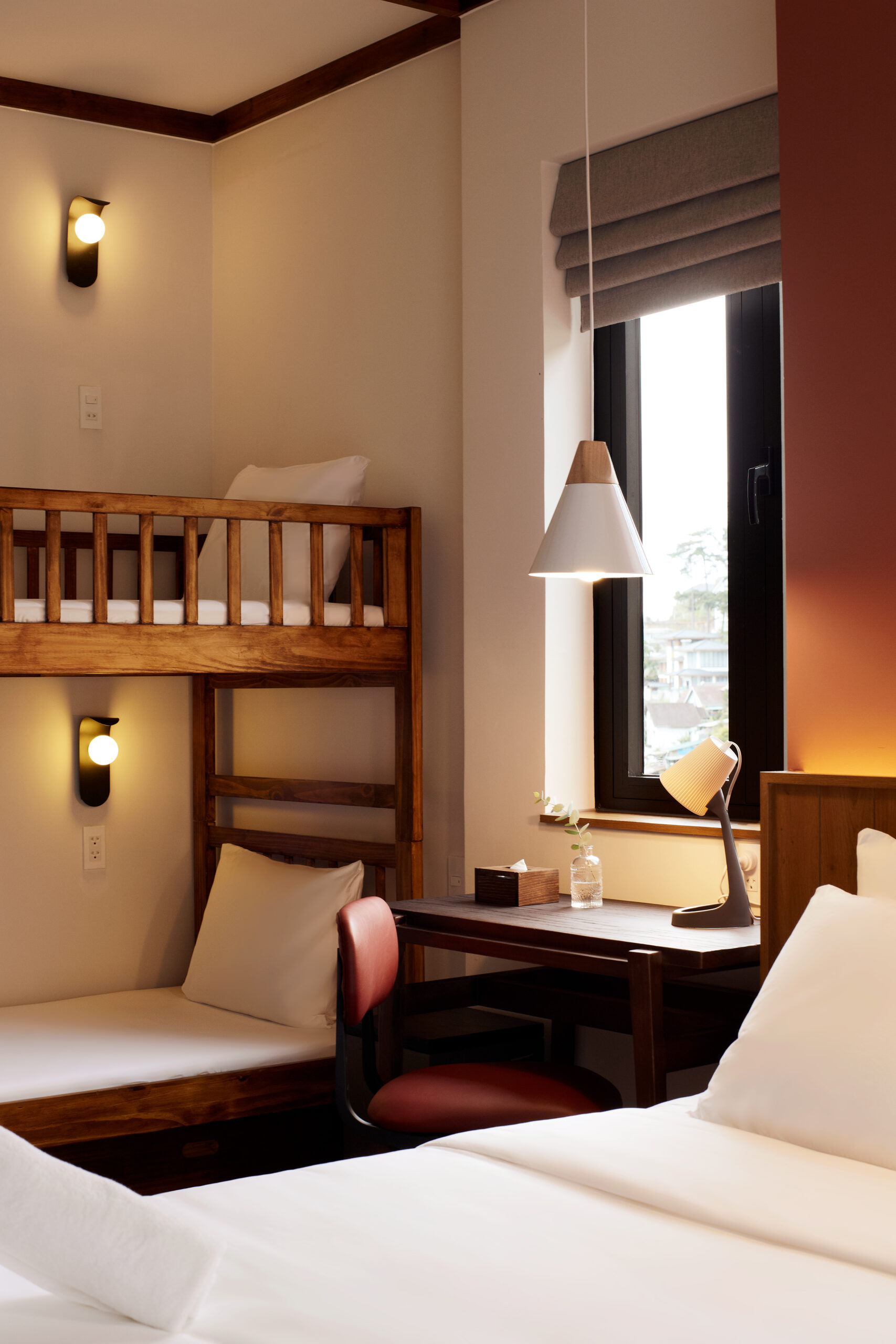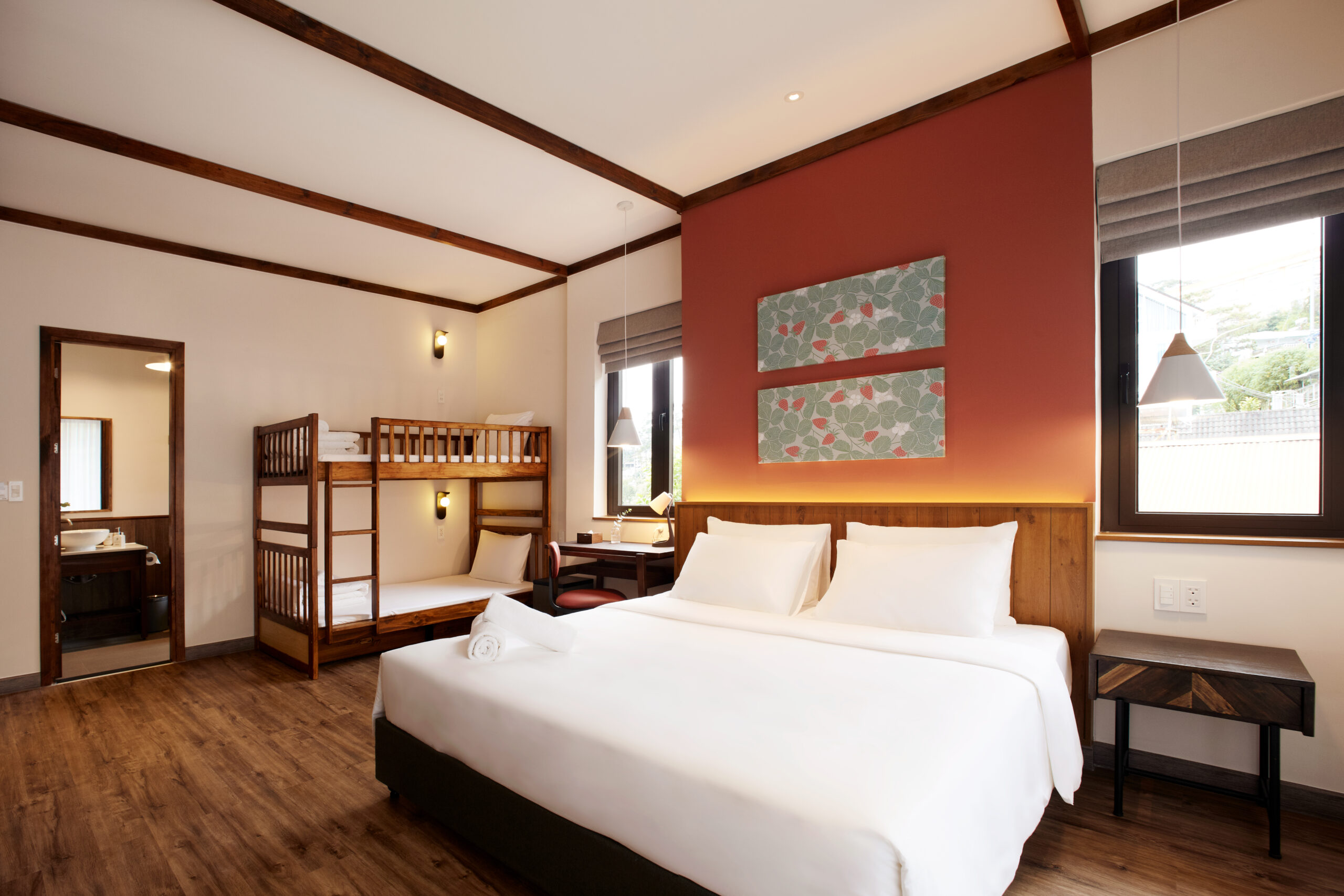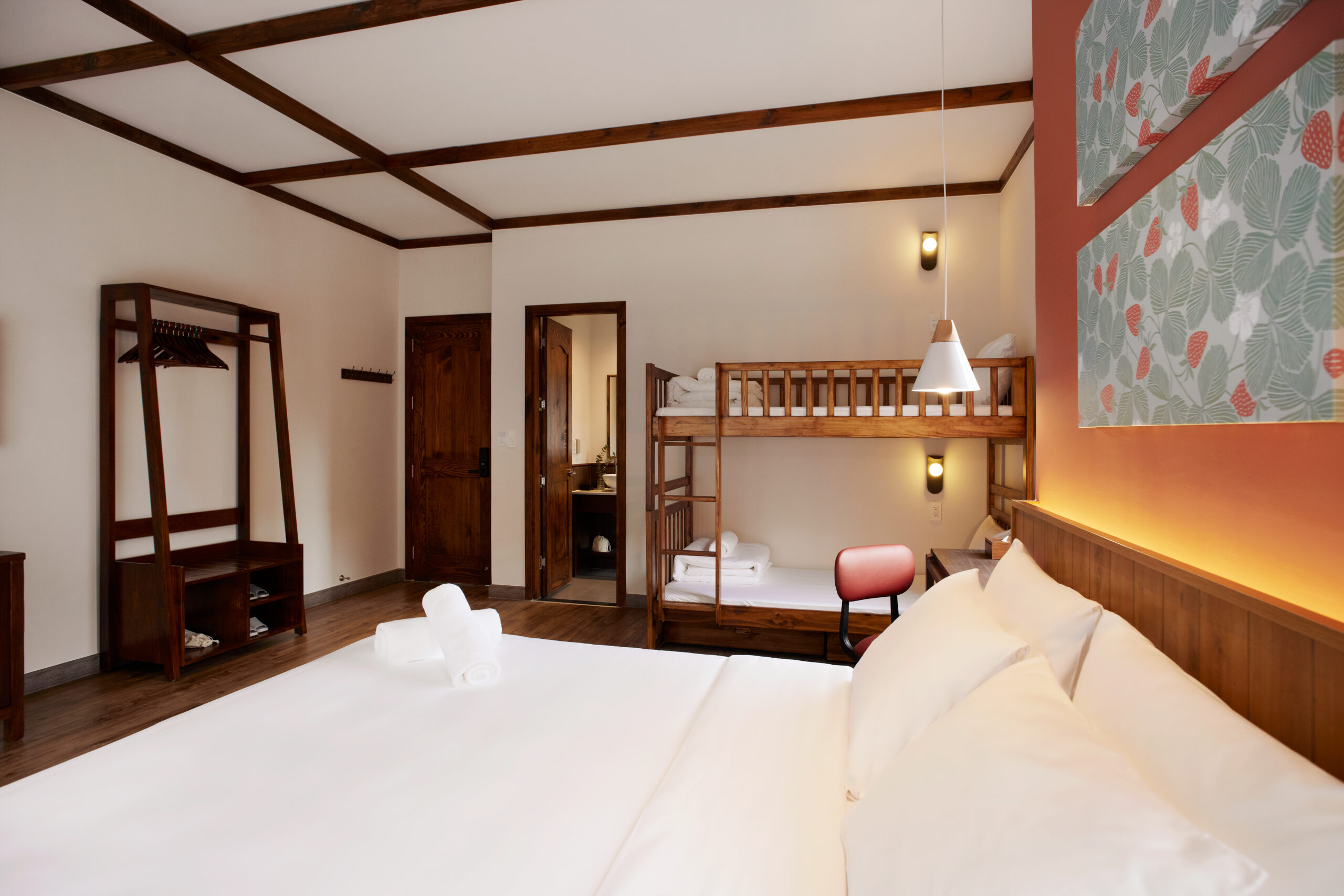 The room is equipped sufficiently for the relaxation of a 4-member family with a King-sized bed and bunk beds.